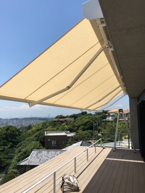 軒が短い建物でも、オーニングを張り出すことで窓を開けたまま換気したり、屋外スペースを快適に使うことができます。